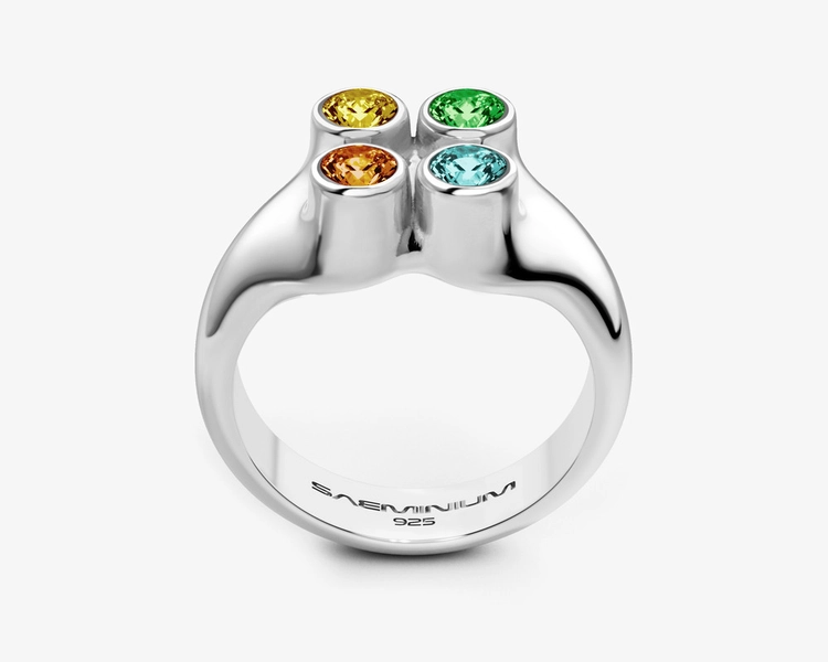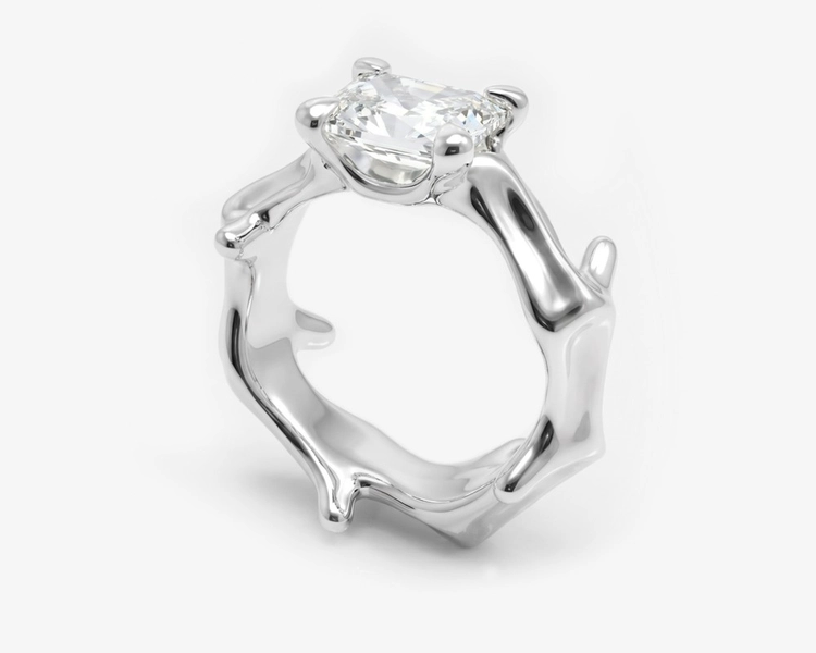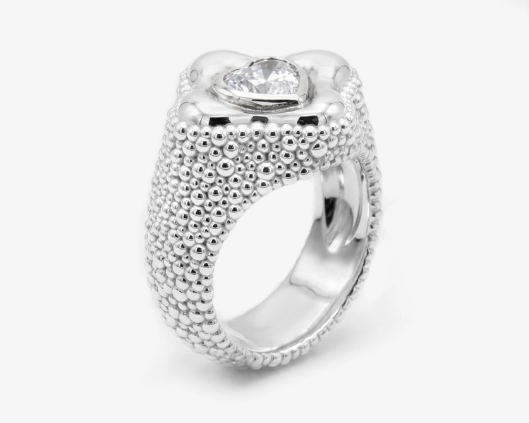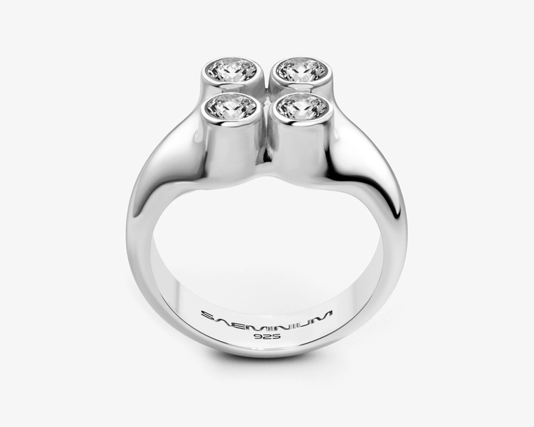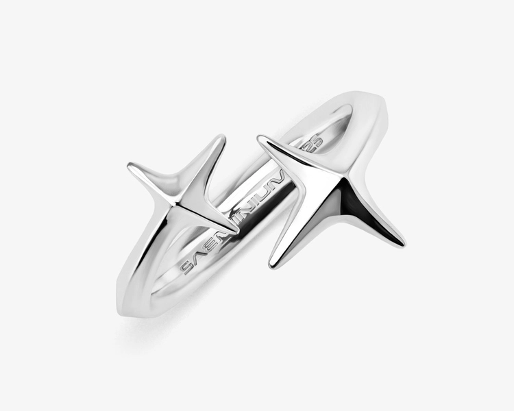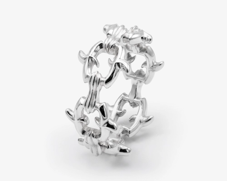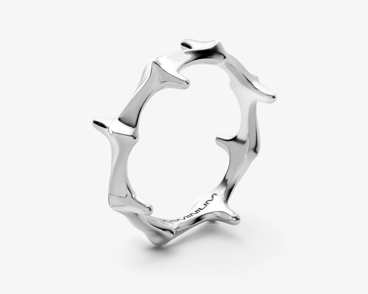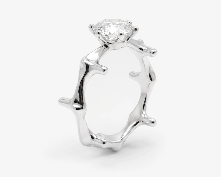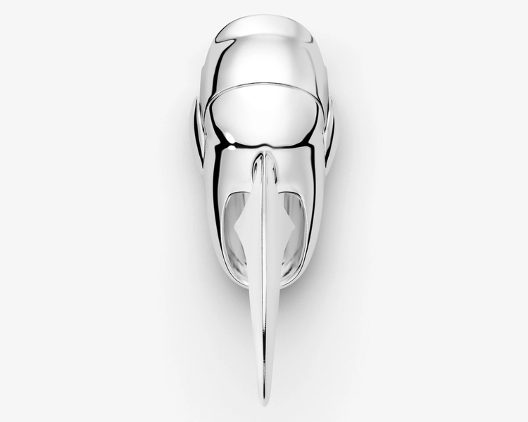 Designed to be worn at the fingertip, the structure extends the conventional idea of a ring, redefining jewelry as a sculptural object that interacts with the body.