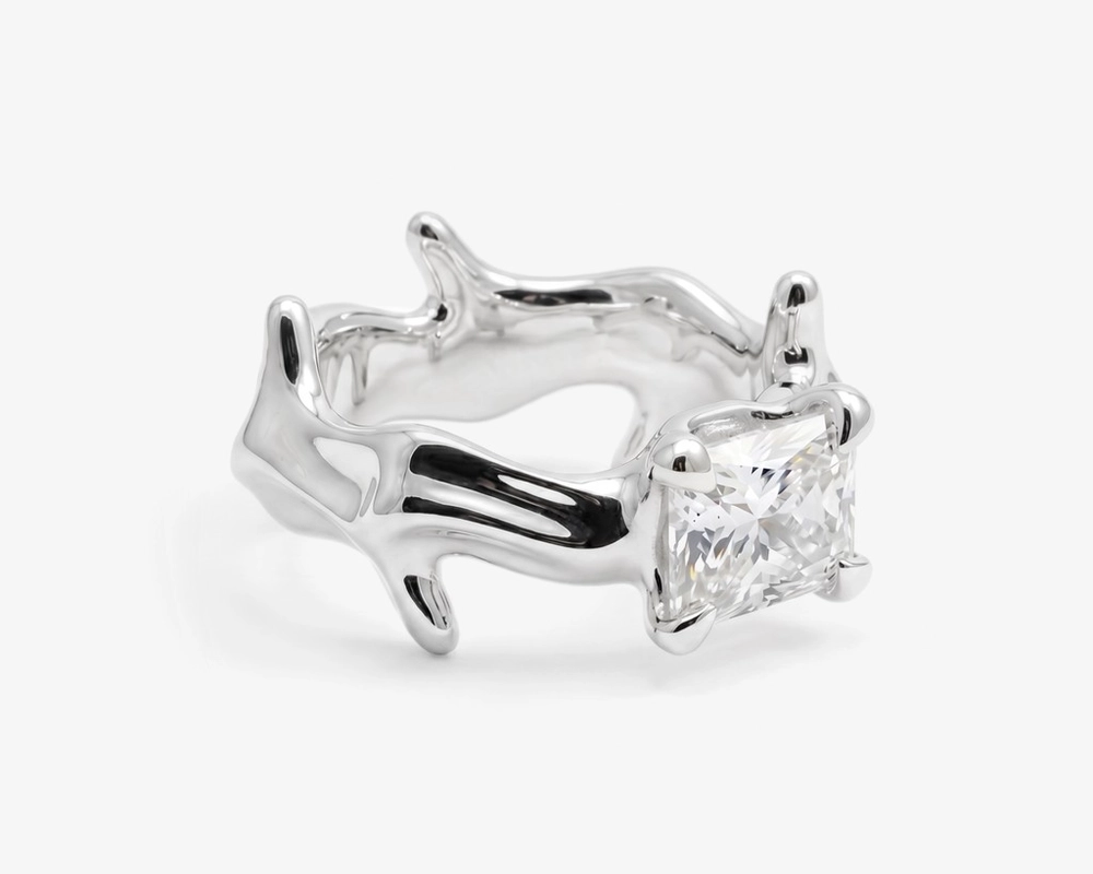 A bold ring defined by an undulating form encircled with spike-like elements with square stone setted.